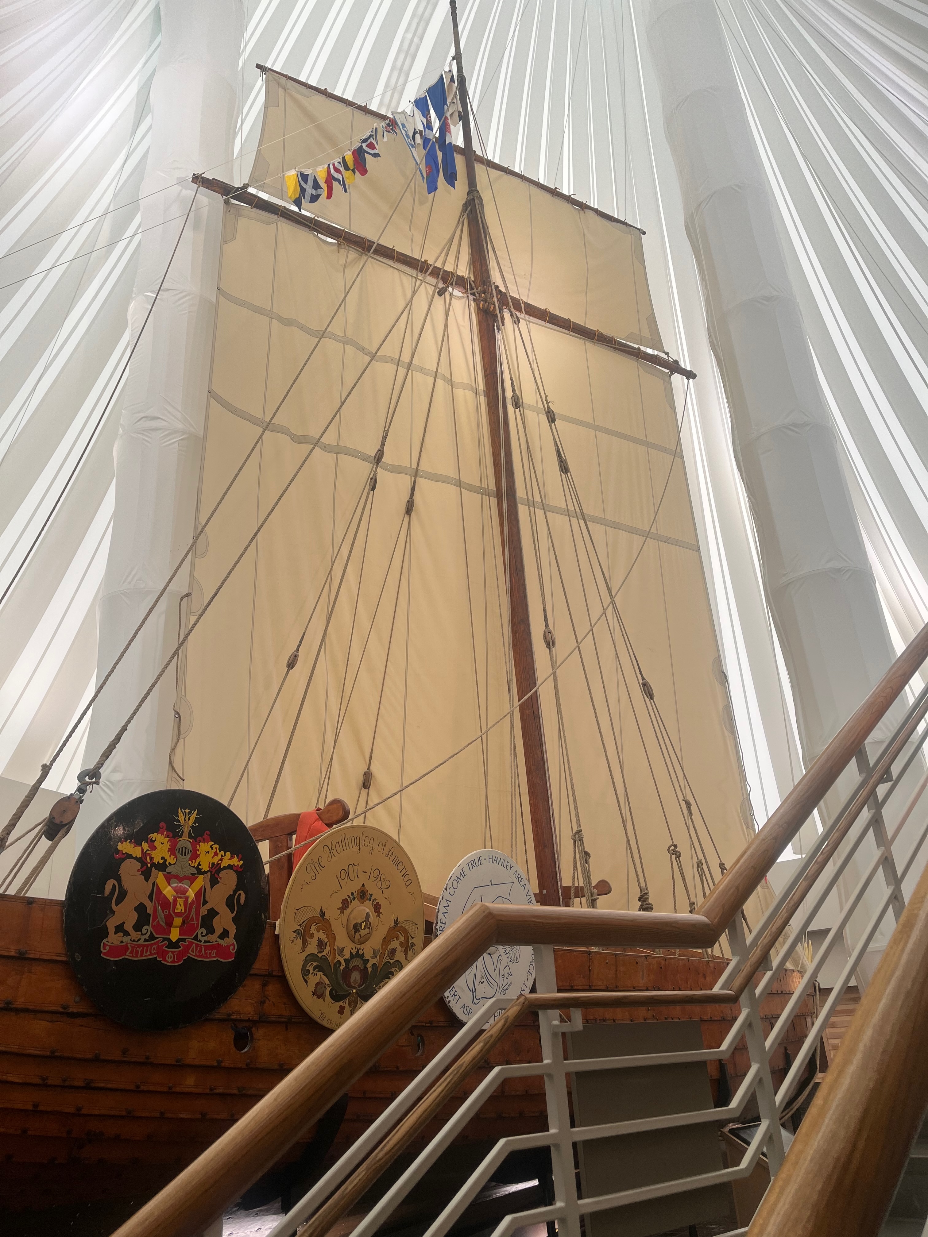 The ship is preserved indoors, with the crew’s story displayed along the walls.